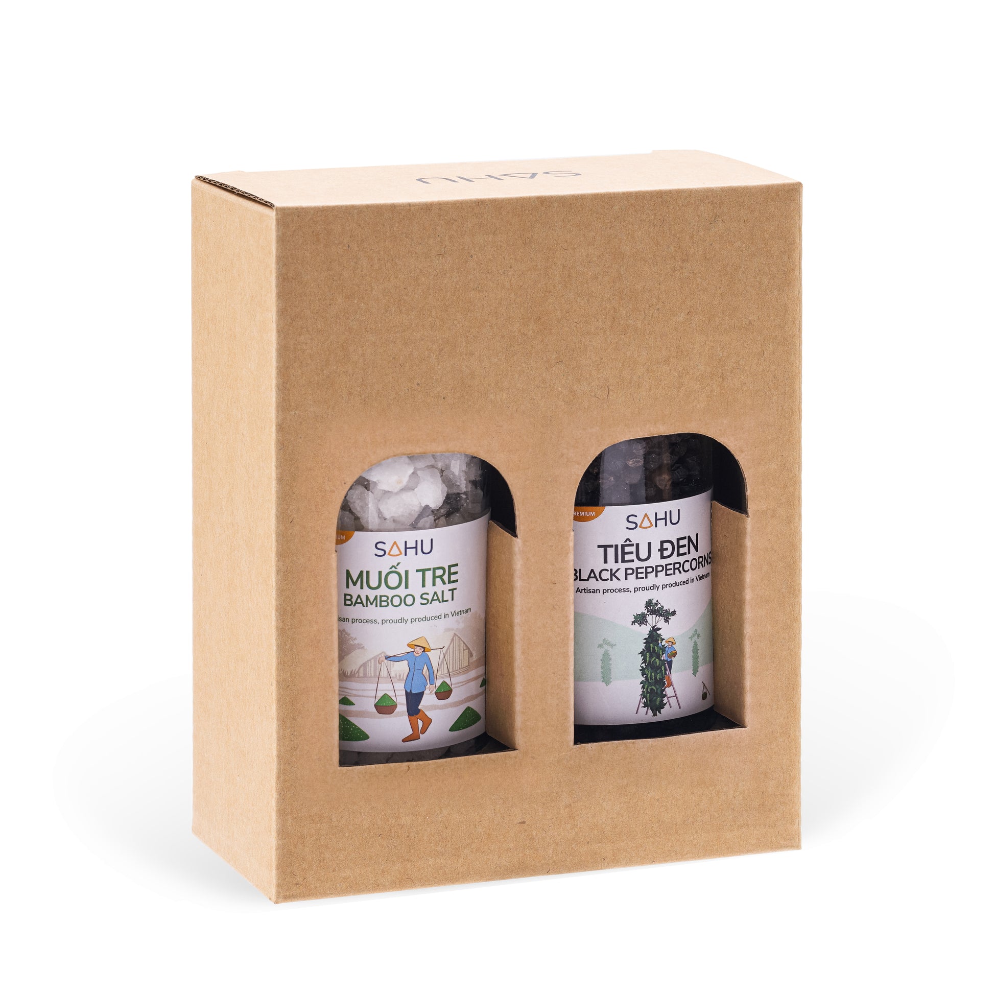 This combo set includes two premium products: Sahu Premium Bamboo Salt and Tiên Phước Black Pepper, packaged in a reusable grinder.