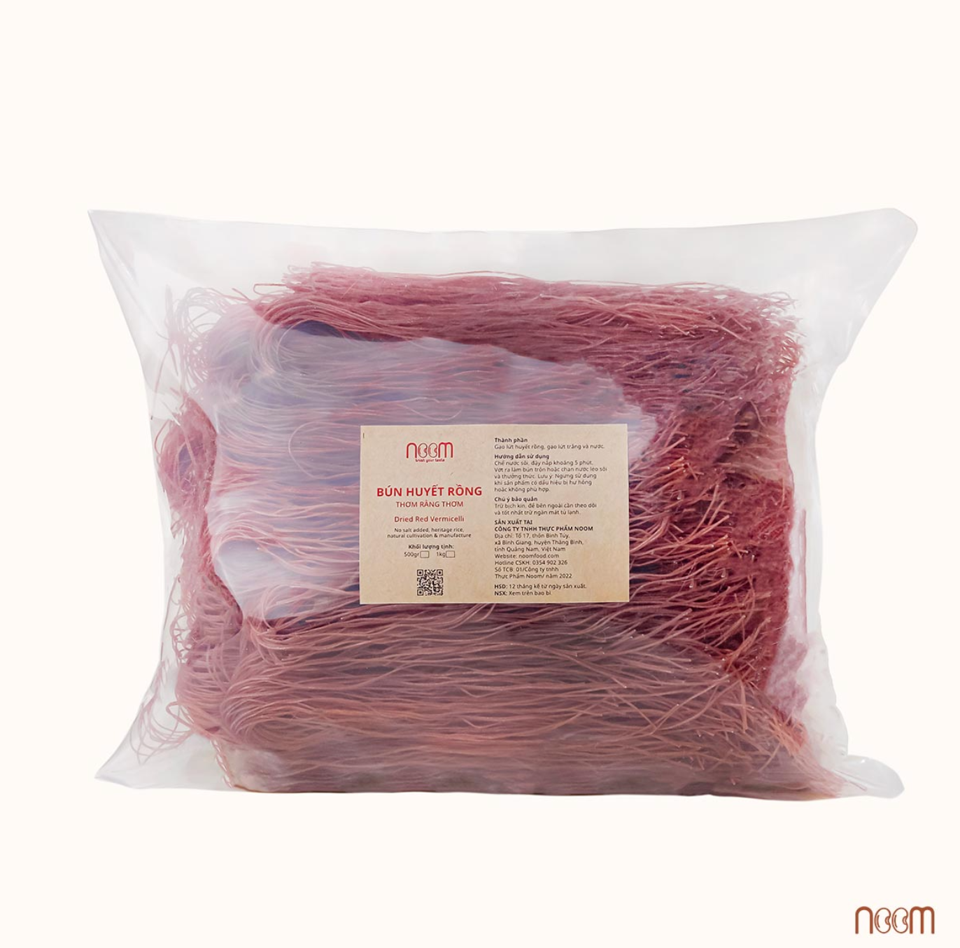 Bún huyết rồng thơm rằng thơm Noom là bún khô với tỷ lệ gạo lứt huyết rồng cao nhất tại thị trường hiện nay 50% gạo huyết rồng, có màu đỏ của gạo huyết rồng, không pha màu bột củ dền hoặc màu hạt điều đỏ.